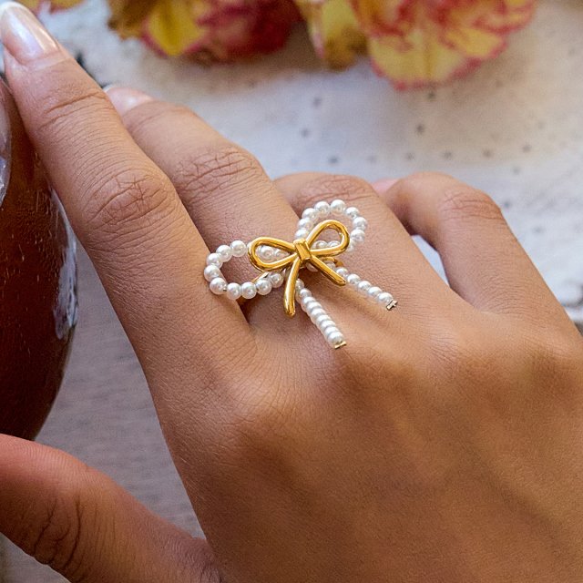 Elevate your jewelry collection with this stunning double-layered ring, designed to bring a touch of charm and sophistication to your everyday style. Crafted from durable stainless steel and plated with luxurious 18K gold color, this ring blends timeless beauty with modern fashion. The delicate pearl and bow design adds a feminine touch, making it the perfect piece for girls who love elegance with a playful twist.