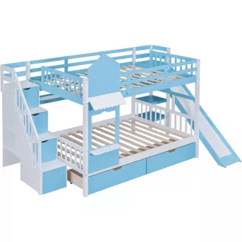 Castle Style Full Over Full Kids Bunk Bed with Slide, Stairs & Storage Drawers