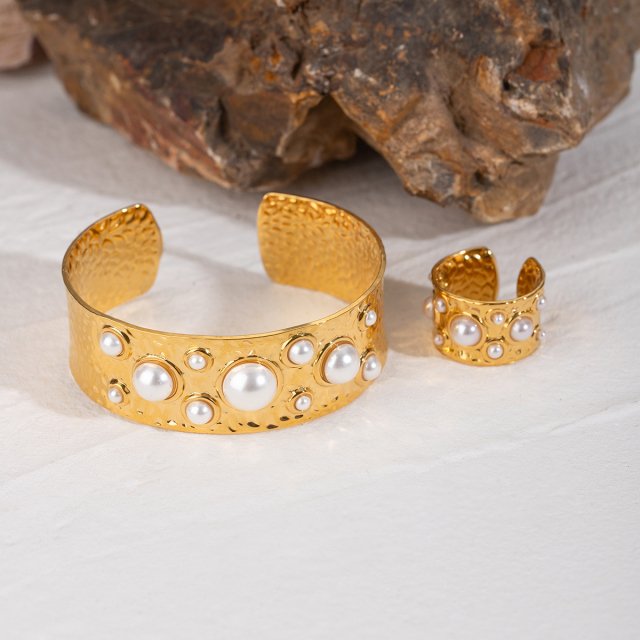 Elevate your style with this stunning hammer-patterned pearl open bracelet and ring set. Designed for those who love a blend of classic charm and contemporary flair, this jewelry set makes a sophisticated statement at any occasion. The unique hammered texture paired with the lustrous pearl detail creates a bold yet graceful look that never goes unnoticed.