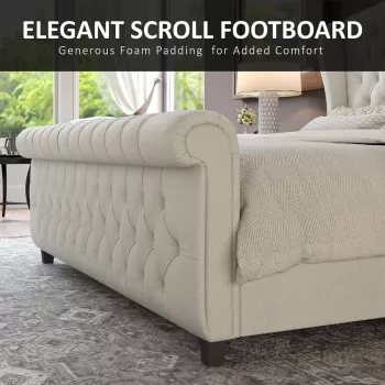 King Size Chenille Upholstered Sleigh Bed Frame with Scroll Wingback Headboard